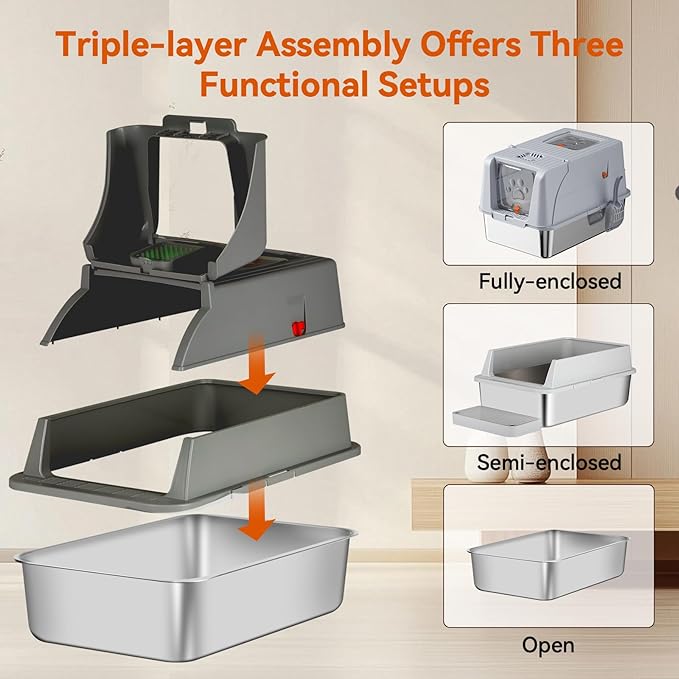 - Innovative Design: The modular stainless steel litter box can be assembled as either an enclosed or semi-enclosed unit to suit different needs. The enclosed setup provides privacy and helps contain litter and odors, while the semi-enclosed option offers a more open space and easier access for cleaning.