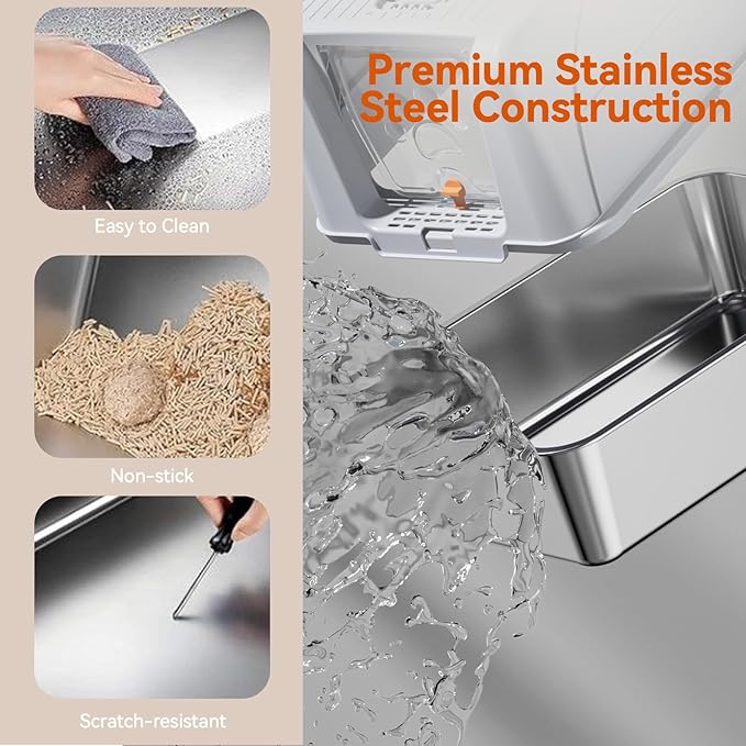 - The bottom basin is crafted from durable stainless steel, offering greater longevity than plastic litter boxes. Its sturdy, non-deforming build with a smooth, non-stick surface makes cleaning effortless.
