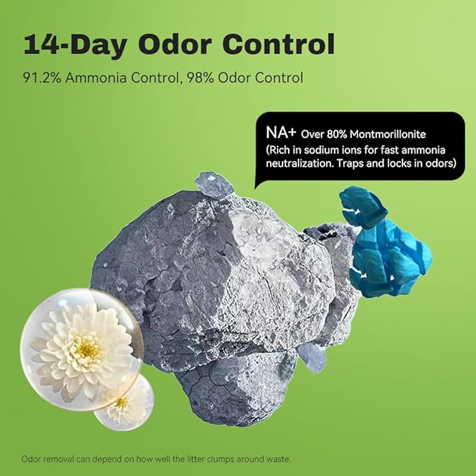 - 14-Day Odor Control: Enjoy a fresher home all week long. Our moisture-activated micro-granules lock in odors instantly, while natural sodium bentonite seals waste tight for up to 14 days of odor-free protection.