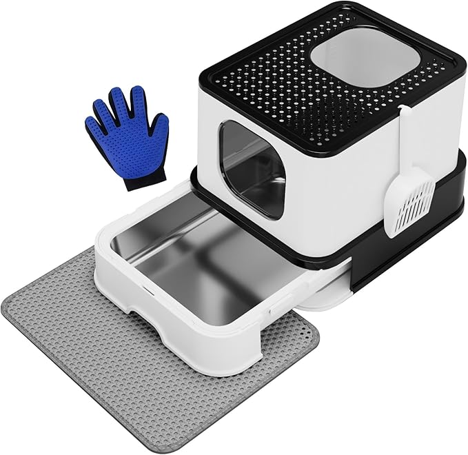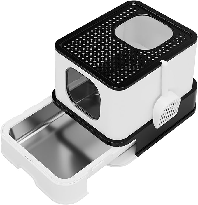 - Removable Sifting Tray & Easy-Clean Design: Features a slide-out stainless steel sifter tray that separates waste from clean litter effortlessly. The fully detachable design enables quick cleaning without disassembly - simply pull out the drawer, rinse and reload. Ideal for pine pellet or clumping litter systems.