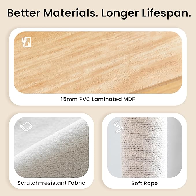 - Built for Long-Lasting Scratching:Made with 7 fully wrapped cotton rope posts and ultra-fine fiber cloth posts, it is more wear-resistant and less prone to shedding. Effectively satisfying the natural scratching instinct of cats.