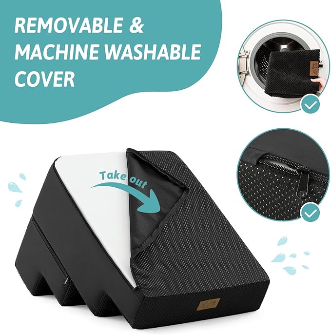 - Non-Slip Base and Removable Cover: Our dog steps for beds are equipped with a non-slip base featuring rubber dots for extra grip, minimizing movement during use. The pet steps cover is waterproof on the inner side, so you donโt have to worry about stains seeping into the foam. The outer cover is removable and machine washable for easy cleaning