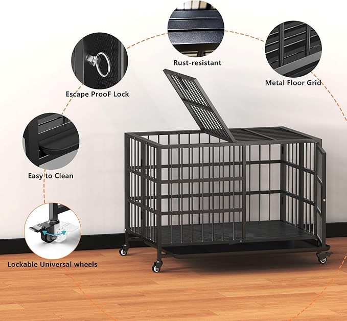 42in Heavy Duty Dog Crate, Rust-Resistant Folding Metal XXL Dog Cage Suitable for Medium to Large Dogs, New Upgrade Single-Handed Latch with Removable Tray and Wheels