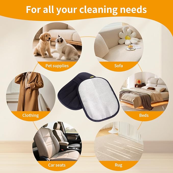 - 【Multi-Purpose for Pets & All Fabric Surfaces】This versatile tool works double duty: it’s ideal for gentle grooming of cats, dogs, and other furry pets (removing loose fur to keep their coats clean and healthy), and also effective for fur removal on almost all fabric surfaces. Use it on sofas, beds, carpets, curtains, clothing, car seats, and even laundry—no more tedious spot-cleaning or rolling, just slide your hand to eliminate pet hair anywhere.