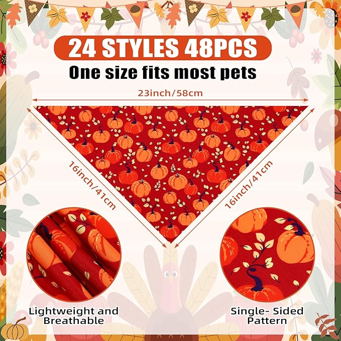 - Abundant Fall Styles: you will receive 48 pieces of dog bandanas, a total of 24 different fall pattern designs, each featuring adorable autumn designs like pumpkins, maple leaves, pine cones, and turkeys, which can meet various daily needs of your dog, making it easy to dress up your furry friend with style and comfortable gifts