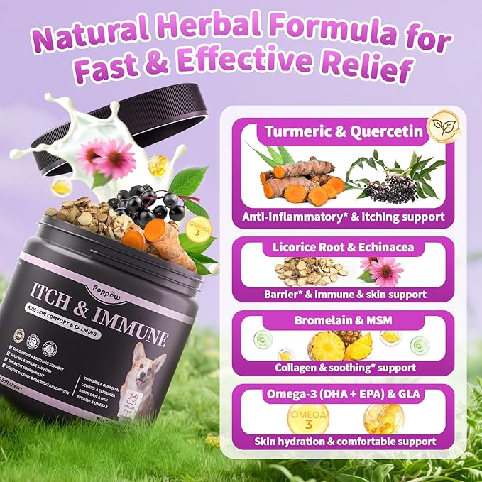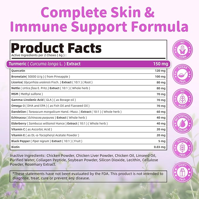 - Skin Comfort & Soothing Care – Our dog allergy chews are formulated with turmeric and quercetin to help maintain skin comfort, ease occasional itching, and support dogs’ sensitive skin when challenged by scratching