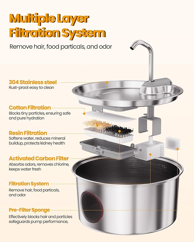 - 【Dual filtration system】Equipped with activated carbon filters and pre-filtered sponges, ensuring that your pets enjoy fresh and healthy water; Intelligent water circulation increases oxygen in the water and maintains its freshness and taste;SUGGEST REPLACING THE FILTER ELEMENT ONCE A WEEK