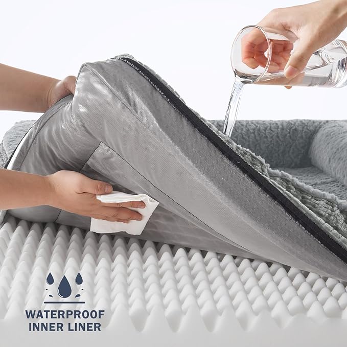 - 🐶WATERPROOF & WASHABLE DOG BED: The dog bed features a fully removable, machine-washable cover with a smooth double zipper for easy to quick remove and care, so just throw it in the washing machine and will be as good as new, ensuring your pet's space stays fresh and hygienic. The waterproof inner lining on the back of the dog bed cover fully protect the egg crate foam from spills, water damage, or accidents, prolonging the product's life.