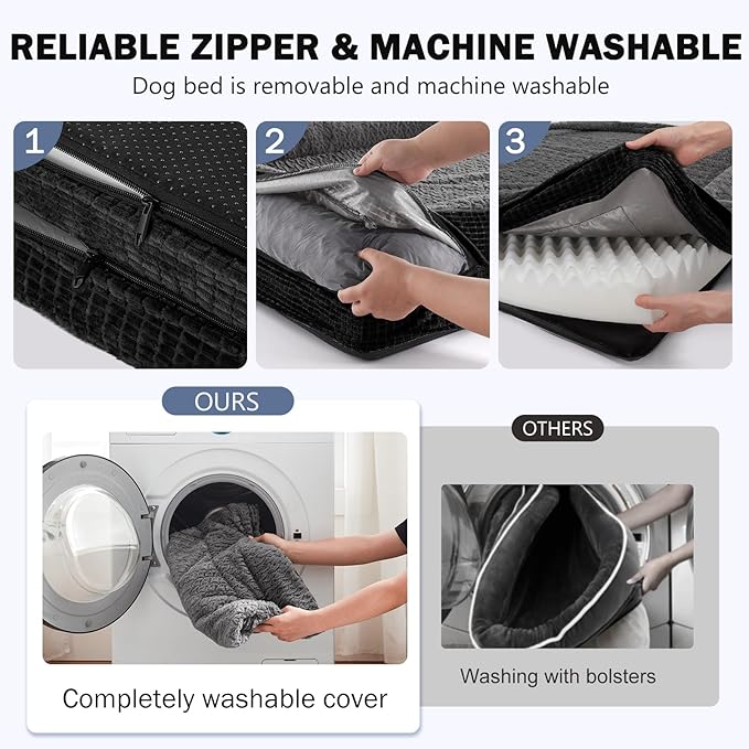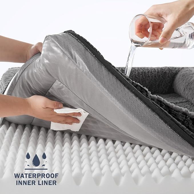 - 🐶WATERPROOF & WASHABLE DOG BED: The dog bed features a fully removable, machine-washable cover with a smooth double zipper for easy to quick remove and care, so just throw it in the washing machine and will be as good as new, ensuring your pet's space stays fresh and hygienic. The waterproof inner lining on the back of the dog bed cover fully protect the egg crate foam from spills, water damage, or accidents, prolonging the product's life.