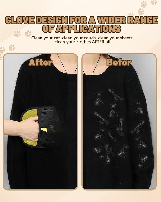 - 2-in-1 Pet Hair Remover Glove: Powered by electrostatic technology and a thoughtful design, our glove effortlessly grabs pet fur in one swipe—no more struggling with sticky lint rollers that run out mid-clean or brushes that just push hair around. It works wonders on clothes, furniture, carpets, and more, making pet hair cleanup quick and hassle-free