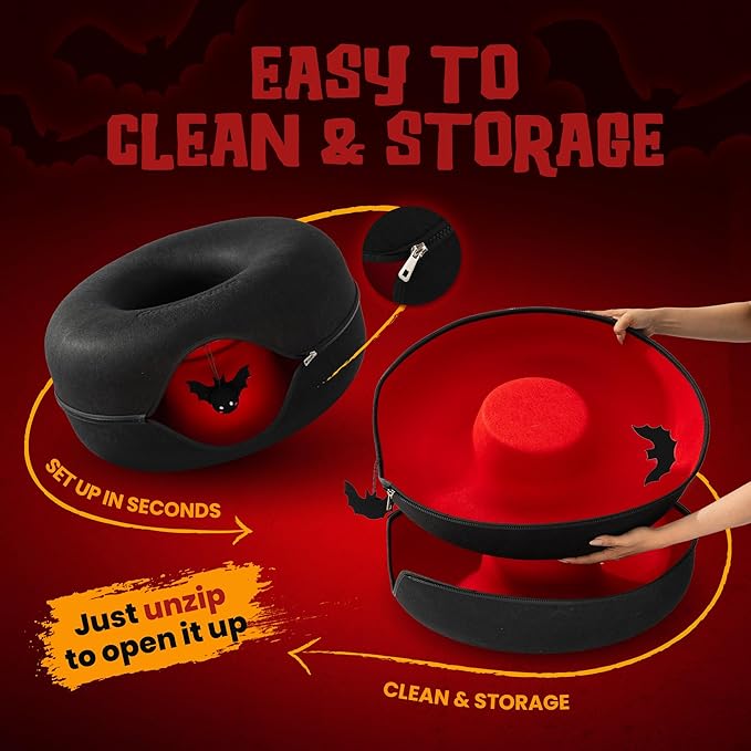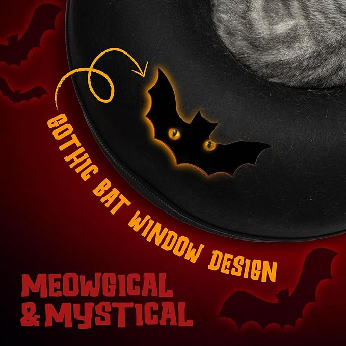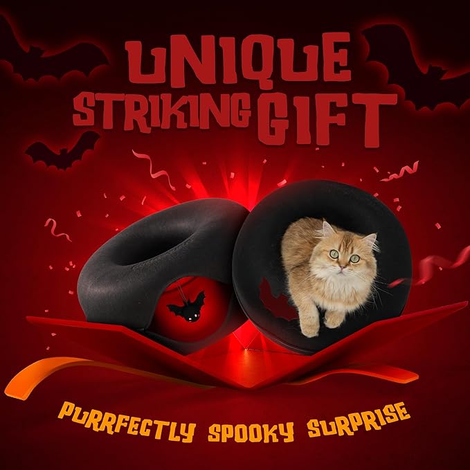 Cattasaurus Halloween Peekaboo Cat Cave for Multiple & Large Cats Up to 30-45 Lbs, Scratch Detachable & Washable Tunnel Bed, Comfy Donut Cat Cave (Gothic Bat, Large)