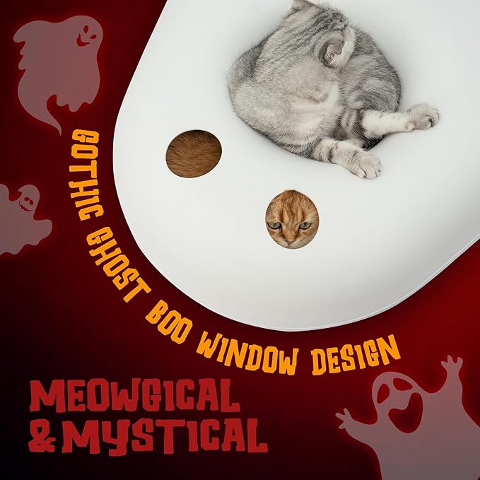 Cattasaurus Gothic Halloween Peeka-Boo Cat Cave, Extra Spacious for Multiple & Large Cats 15+ lbs, Scratch Detachable Cat Beds for Indoor Cats, Washable Tunnel Bed (White Ghost, Jumbo)
