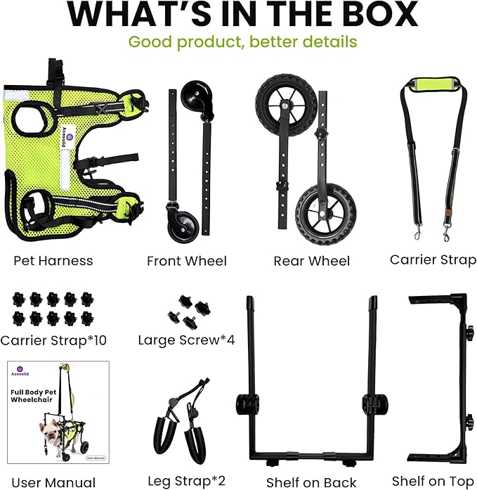 - 【360° Safety Protection | High-Visibility Design】 Includes lime-green reflective vest and leash for low-light visibility. The 4-wheel structure provides balanced weight support with non-slip suspension boots, ensuring comprehensive safety for disabled pets.