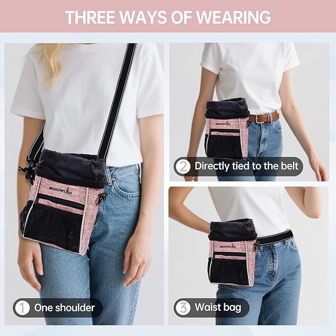 - Multiple Carry Options: This dog treat pouch can be worn in various ways to suit your comfort, including an adjustable waistband, crossbody style, or belt clip, ensuring you have hands-free convenience at all times.