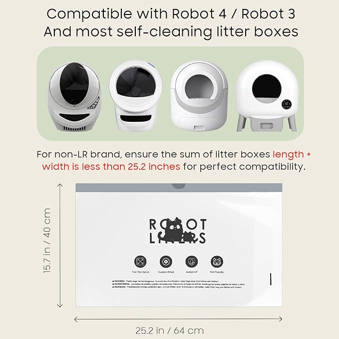 - CUSTOMIZE DESIGN: The litter box liners are perfectly compatible with Litter Box Robot 4 Litter Box Robot 3 and most automatic litter box (which Pan's Length + Width < 25.2 IN). Optimal transparency ensure precise sensor reading of drawer capacity to prevent machine error alerts (Design through user testing data)