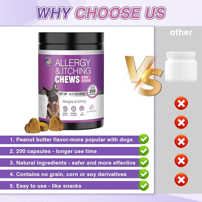 - Long-Lasting Supply for All Breeds and Sizes:Each jar contains 200 dog anti itch chews, allergy bites for dogs offer a cost-effective way to maintain dog’s health over time. Probiotic chews for dogs for itching are suitable for small and large breeds of all ages. Flexible dosing ensures tailored support for every pet. Delicious peanut butter flavor make allergy treats for dogs easy and enjoyable to administer. Follow instructions, and watch dog regain energy with trusted dog allergy relief chews