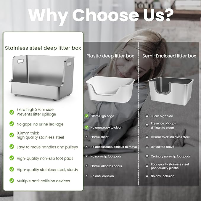 - Odor-Free & Quick to Clean: Unlike plastic, stainless steel does not absorb odors. The smooth non-stick surface allows you to simply rinse and wipe clean in seconds, keeping the litter box fresh with minimal effort.So, if you donโt like the odor of plastic cat litter boxes, but want easy cleaning, this stainless steel litter box is a great choice for you!