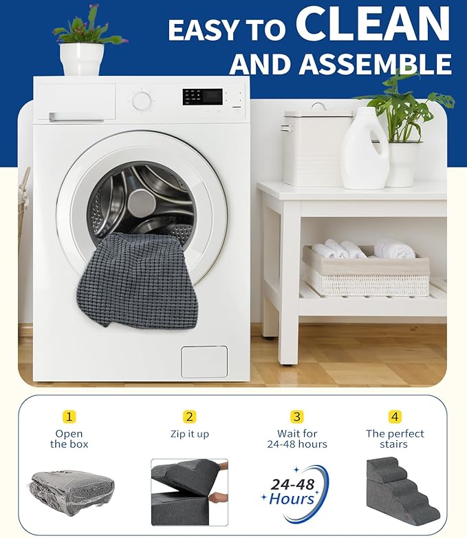 - Easy to Clean - The dog stairs feature a removable, machine washable cover for effortless cleaning. Using without assemble, our pet stairs provide a safe and convenient way for your furry friend to access higher surfaces without the risk of injury or strain on their joints