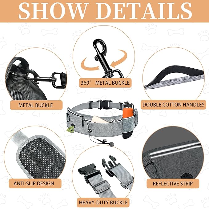 - 【ADJUSTABLE WAIST BELT & Reflective MULTI-FUNCTIONAL DESIGN】dog leash waist belt 1.1” adjustable belt fits all waist sizes (men and women) securely and comfortably. Dual D-rings add versatility. Enjoy true hands free leash freedom—swing your arms, answer calls, or jog effortlessly while your body weight naturally manages your dog’s movements. Designed with reflective stitching throughout the leash and fanny pack, dog leash ensures extra visibility during nighttime walks, enhancing the safety of both you and your dog
