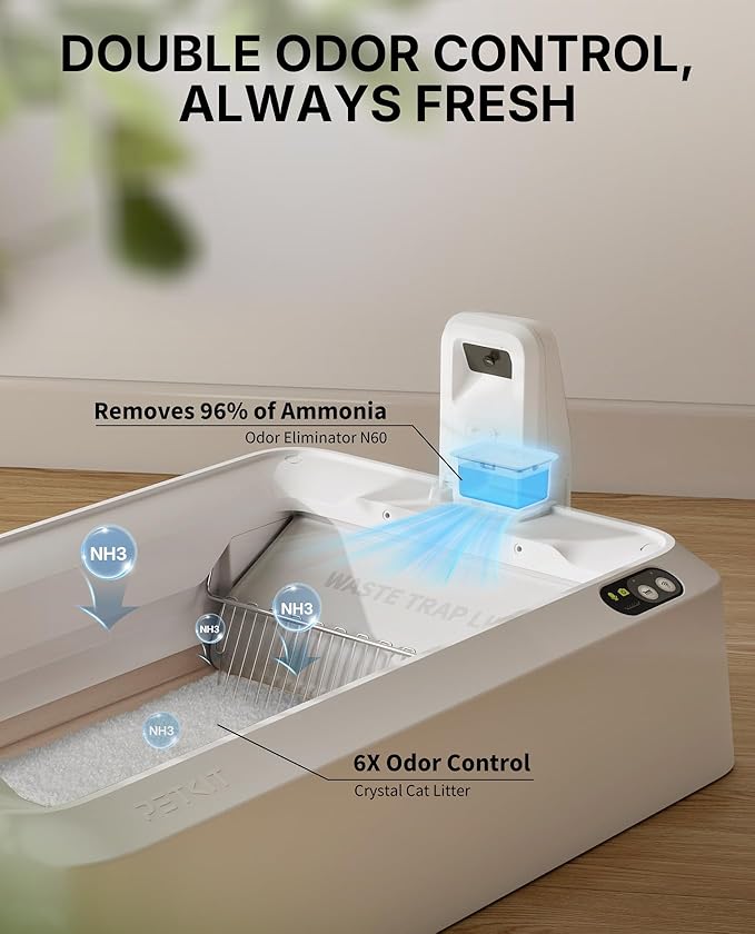 - Double Odor Control: It comes with high-efficiency odor-neutralizing and absorbent crystal litter, and when paired with PETKIT N60 odor control (96% ammonia removal), creates a fresh bathroom environment for your feline.
