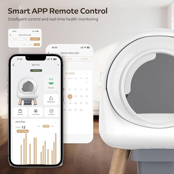 - Smart App Control & Custom Scheduling:Manage settings remotely via 2.4GHz Wi-Fi and the companion app. Monitor usage trends, track litter levels, and schedule cleanings around your cat’s routine—or trigger manual cycles and toggle Kitten Mode with a single tap.