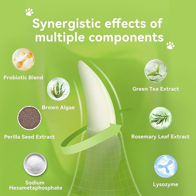 - Dog dental care Our dog teeth cleaning powder contain Deep sea kelp, plaque targeting lysozyme & stain shielding hexametaphosphate soften tartar without brushing. Our dog dental powder also has antioxidant green tea, rosemary and perilla,can reduce gingival bleeding,soothe gums. A healthier mouth is just a simple sprinkle away , goodbye toothpaste, brushing fuss.
