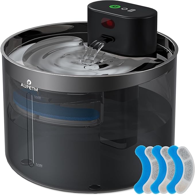 - [45-60 Days Exceptional Battery Lif]: The AUPETM battery operated cat water fountain is equipped with a 5000mAh rechargeable battery, which can provide fresh and clean drinking water for up to 45-60 days when fully charged. Wireless cat water fountain even during power outages or short trips, it can provide sufficient running water for your beloved pets.